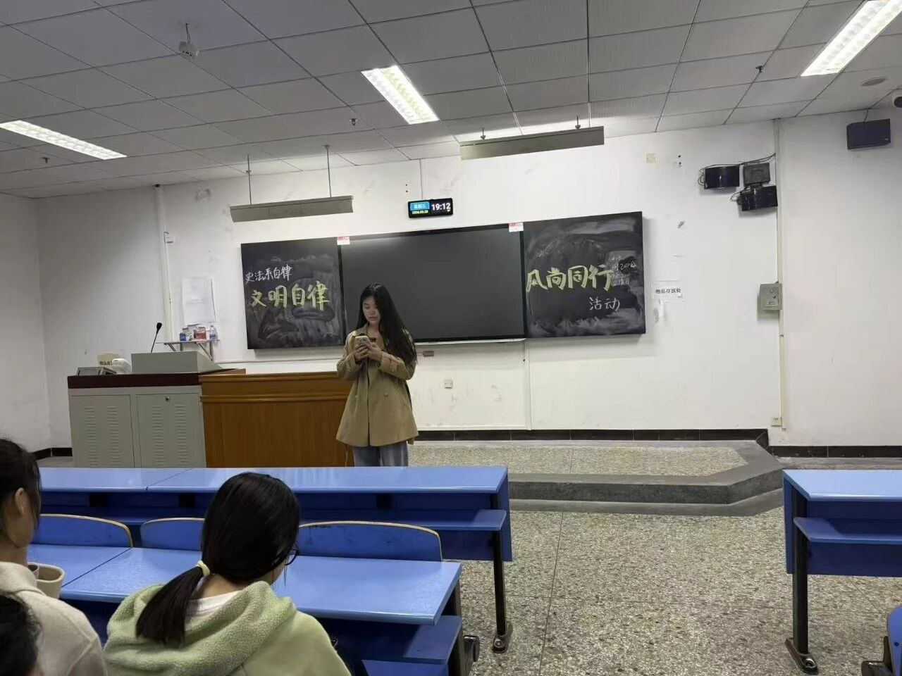 督察部同学带来的文明校园建设讲解,细致全面地介绍了日常行为规范与校园秩序要求,引导大家从点滴小事做起,自觉践行文明公约。活动最后,全体同学认真书写文明标语,将对文明的理解与期许凝于笔端,许下文明自律的青春承诺。