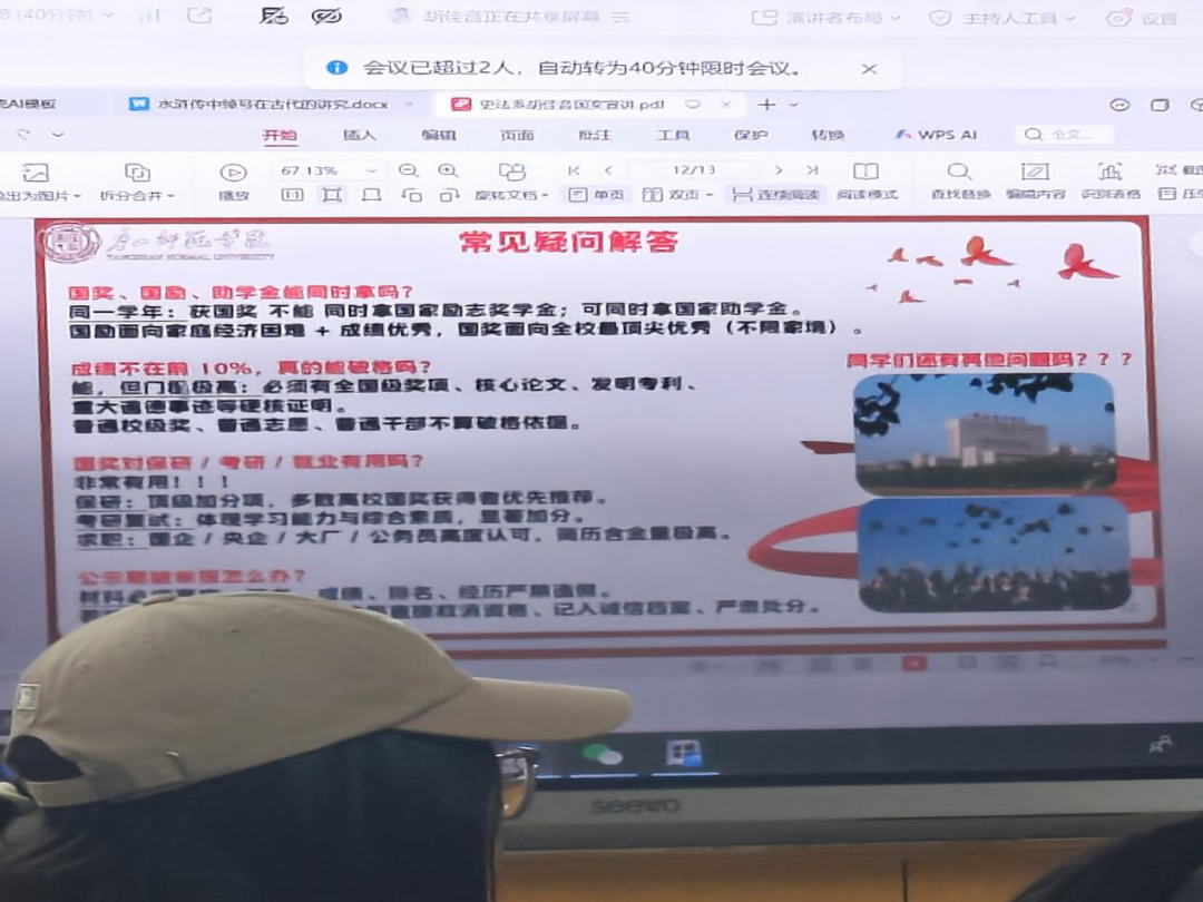 随后,刘苏颖同学逐一梳理国奖申报的核心硬性条件与评审全流程,重点讲解获奖互斥规则、公费师范生申报专项限制、评审回避制度、纸质版与电子版材料填报规范等关键事项,针对奖学金不可兼得、师范生身份申报差异、材料提交顺序等高频疑问细致拆解,将申报细节、政策底线讲清讲透,帮助同学们有效规避申报误区。