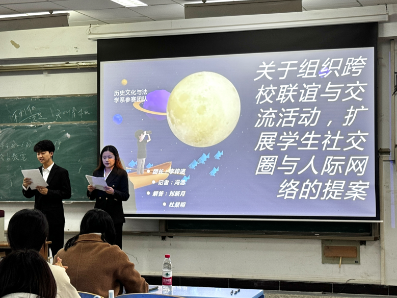 比赛现场,各参赛团队依次依托PPT进行提案阐述,在5分钟内清晰阐述议题背景、调研过程、核心方案及预期成效,展现出对校园问题的敏锐洞察与深入思考。提案阐述结束后,进入质询答辩环节,各队记者围绕提案内容展开针对性提问,每队接受不超过3个问题的质询并在3分钟内完成作答,评委团也结合提案内容追加提问,团队成员通力协作、现场应答,充分展现了良好的临场应变与团队协作能力。